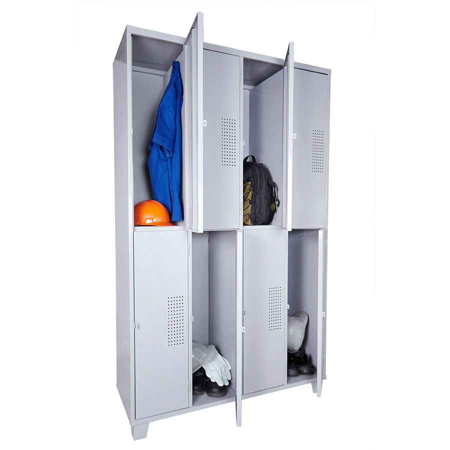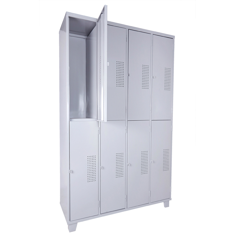 Roupeiro de Aço com 08 Portas Grandes em “CHAPA 26”com Pitão para Cadeado, ideal para empresas de engenharia civil, empreiteiras, obras, entre outras. Possui gancho para pendurar roupas, portas ventiladas e pés elevados.