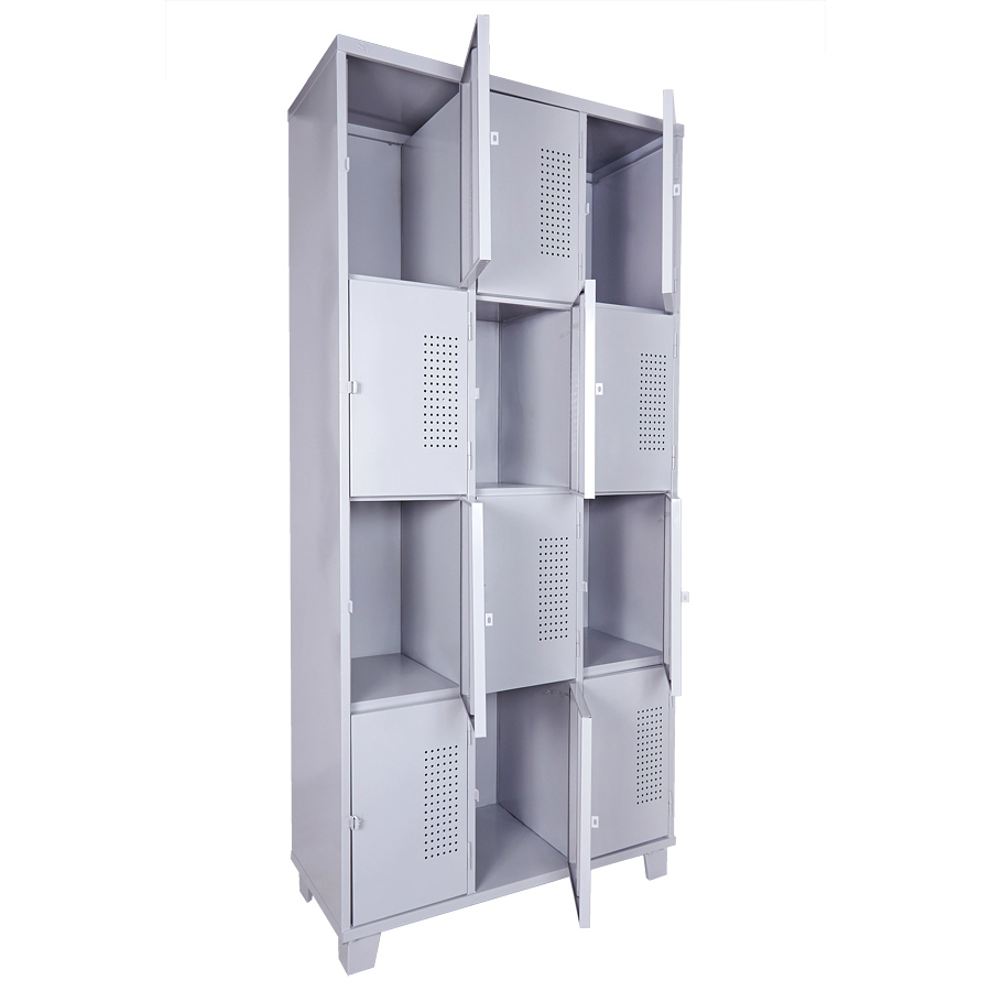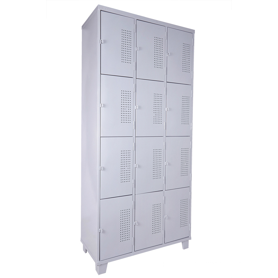 Roupeiro de Aço com 12 Portas Pequenas em “CHAPA 26” com Pitão para Cadeado, ideal para academias, supermercados, empresas e para uso em geral. Possui portas ventiladas e pés elevados.